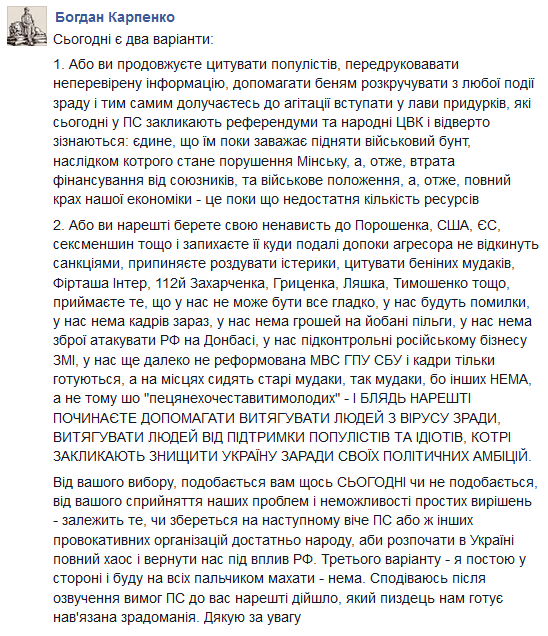 Натяжчим, звісно, було визнати, що для силових дій - принаймні, ще рано. Але пам'ятаймо , по-перше,гарний російський вислів: "При приближении бури первыми исчезают любители делать волны", по-друге, наполегливий і нав'язливий вереск вати про те, як Ярош "злився і усіх злив". Імхо, дозволяти себе розводити на слабо - остання річ.