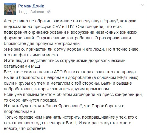 Описано просто епічний пройоб МВС та ЗСУ. Це ЇХ обов'язок контролювати контрабас, а не добробатів. Тому і добробати в цьому звинувачувати не можна. І з гарантієй забезпечити провезення контрабасу можуть тільки МВС та ЗСУ, а не добробати, бо добробати їм підпорядковані. Тому усі звинуваченні в контрабанді - це в першу чергу до МВС. І будь-який контрабас - це обов'язково провина МВС! І вже у другу-третю чергу, можливо, добровольців і їх спонсорів. І, скоріше, саме МВС і кришували контрабас, бо без них - дуже проблемно, можуть і свій блокпост поставити і наглядача а то й і просто замінити особовий склад блокпосту.