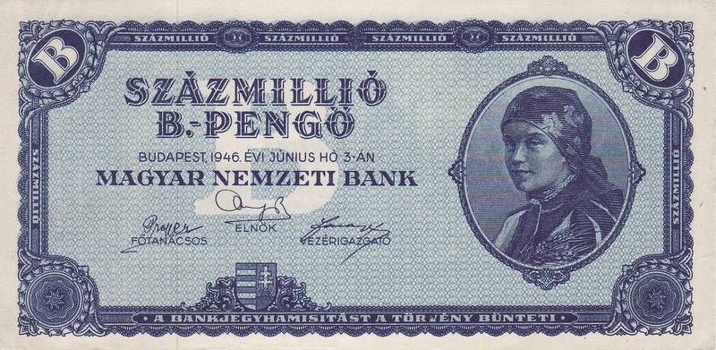 On June 3, 1946 the Hungarian National Bank (Magyar Nemzeti Bank) issued the 100 Million Billion (P-136) or 100 Quintillion pengő.  100 Quintillion is equivalent to 100,000,000,000,000,000,000 or 1020!  Post World War II Hungary holds the record for the highest monthly inflation rate ever – even greater than what the Weimar Republic faced in the 1920s.  Many numismatists consider this to the highest denomination currency ever.