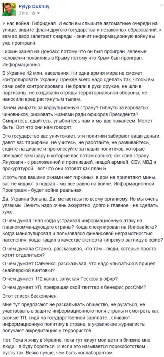 Треба переконувати Захід, що РФ - це загроза світу. Що кожен раз співпрацюючі за Росією, з російським бізнесом, Захід надає гроші на зброю терористам. Потрібно домагатися максимальної ізоляції Росії у всіх сферах по всьому світу, пока вона не распадеться на кілька держав.