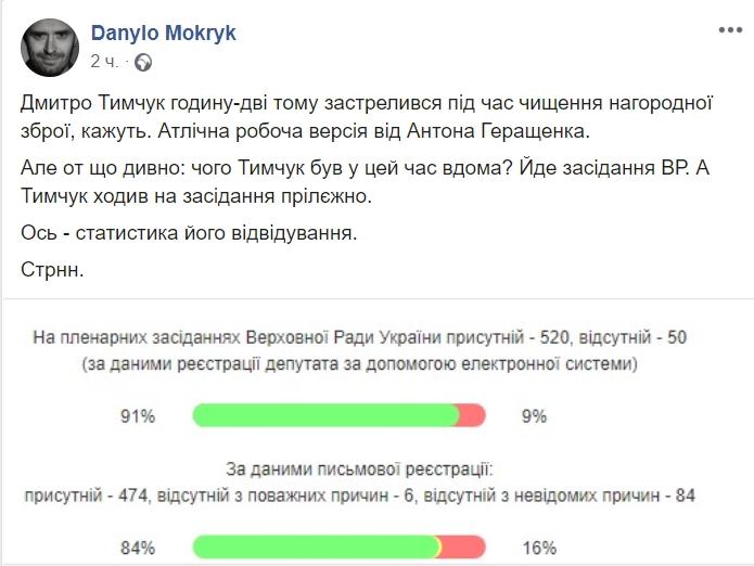 Ще один факт, який наводить на сумніви, привів на своїй сторінці журналіст Данило Мокрик. Він зазначив, що Дмитро Тимчук був старанним депутатом і регулярно відвідував засідання Верховної Ради.