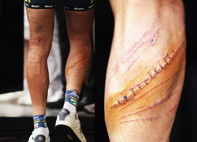 Десь впав явно...Може в "колючку" влетів в полі, де випасають худобу...Може бульдозер його переїхав. Або танк. Але його зашили, помазали йодом, і він попер далі. Бо  - перемога, спонсори команди і все таке інше. Професійний велоспорт - це не футбол. Там від "касанія" по полю не покачаєшся....В велоспорті - всім похєр. Тільки перше місце.