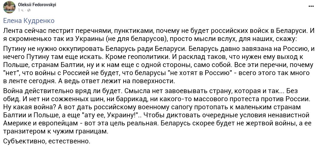 Він допускає введення російських військ до Білорусі, але в якості підтримки для білоруських силовиків, для заняття стратегічних об'єктів, а не для розгону акцій протесту. "Інакше в цьому випадку Російська Федерація стане в очах населення жандармом. Ми всі знаємо, як російські багнети діють. Криво"- каже.
