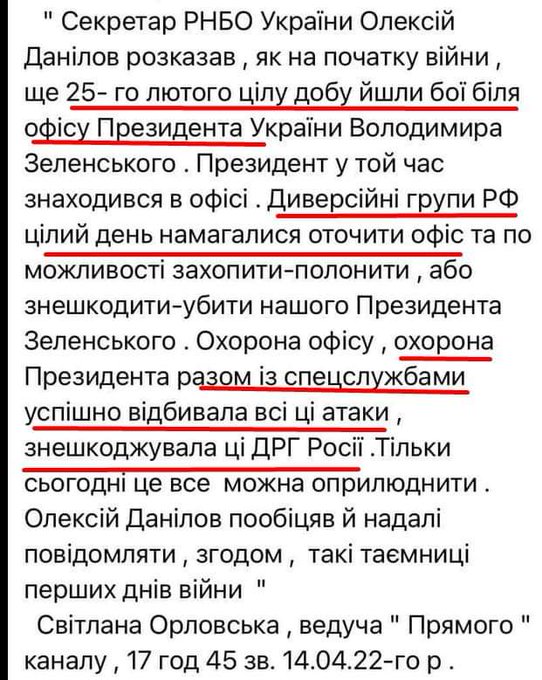 Третє припущення - Данілов не має уявлення що відбувалося 25 лютого й тому верзе те, що йому сказали але не розтлумачили. Бо самого Данілова 25 лютого в Києві не було. Як і Кирила Тимошенко. Як і багатьох нардепів "Слуги народу". Бо_втекли.