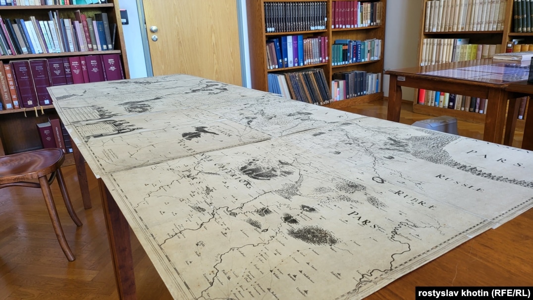 Спеціальна карта України Гійома Левасера де Боплана в Ягеллонській бібліотеці в Кракові. Два зіставлені столи для неї замало – вона ширша і довша