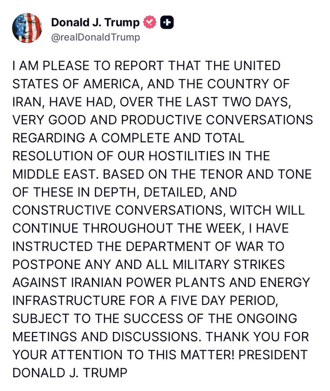 Президент США Дональд Трамп сообщил о том, что Соединённые Штаты и власти Ирана в последние два дня провели "хорошие и продуктивные дискуссии" по вопросу о полном прекращении боевых действий на Ближнем Востоке. Как написал Трамп в соцсети Truth Social, переговоры продолжатся на этой неделе. Основываясь на их ходе, Трамп распорядился отложить удары по энергетической инфраструктуре Ирана на пять дней.