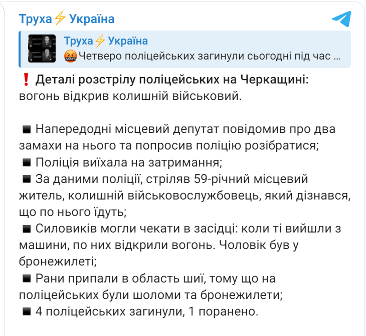 По факту є кілька питань. Чи розуміє керівництво Черкаської поліції, що загиблі сьогодні поліцейські і на їх совісті? Хто з керівництва вирішив "висловити повагу" депутату і наполіг, що стаття із знищення майна стала замахом на вбивство? Точно не загиблі спецназівці і дільничний.