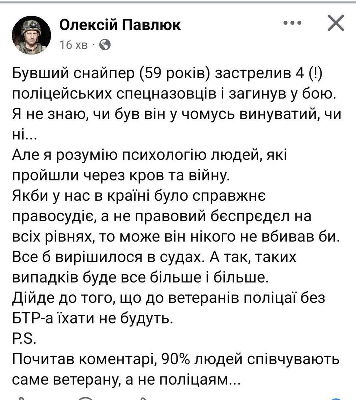 Військовослужбовець, що вбив поліцейських Сергій Русінов служив з 2014 року, підчас повномасштабного вторгнення в 158 і в 198 батальйоні. Його списали за станом здоров'я. Два сини воюють, патріот, побратим і один з кращих друзів загиблого військового героя Олега Собченка.