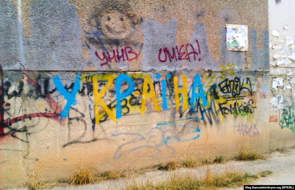 На стенах домов в столице аннексированного Крыма встречаются патриотические проукраинские граффити, 30 июля 2014 года.