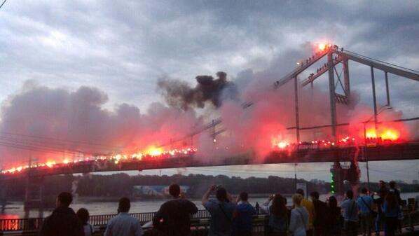Фанати Карпат, Динамо, Ворскли, Чорноморця, Зорі, Металіста зустрілись на пішохідному мості в Києві.
