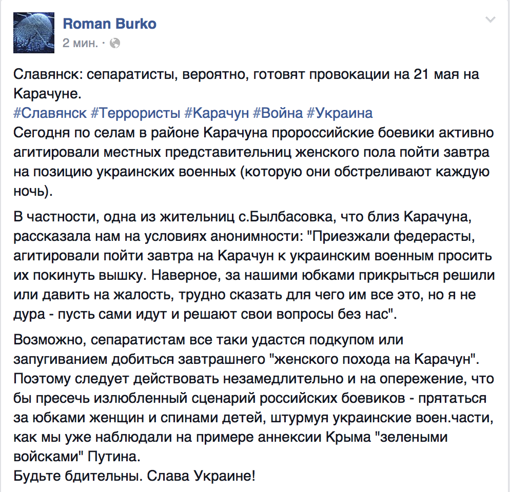 Он сообщает из донецкого городка Славянск, что ситуация в городе если кардинально не поменялась, то уже полностью идет к тому, что российских террористом местное население будет изгонять оттуда мокрыми тряпками.