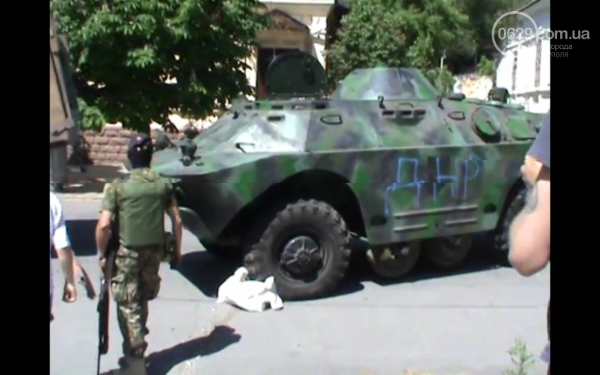 В пресс-службе ДНР 0629 сообщили, что  вооруженные люди в масках  - представители силового блока ДНР, которые защищают штаб республики, находящийся на улице Греческой.  Что касается бронетранспортера, то это также машина Донецкой народной республики. Откуда взялась боевая машина, в пресс-службе не сообщают.